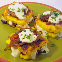 These are a wonderful little addition to any dinner. Creamy sweet polenta topped with savory onions and mushrooms, seasoned with fresh thyme and added to the "sandwich" is a sweet Mascarpone cheese sauce. Dramatic rustic presentation is sure to please!
