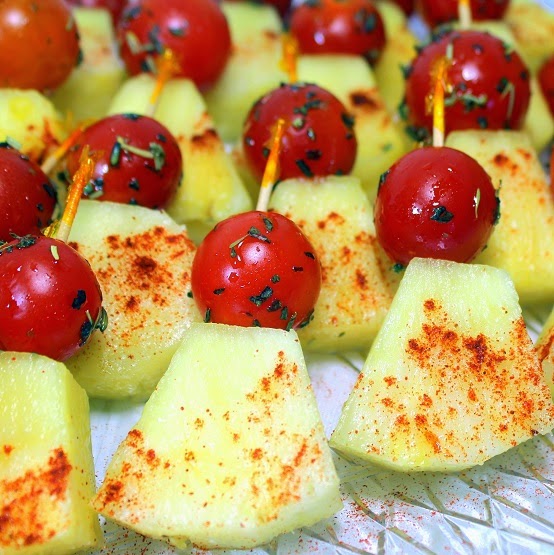 More Food on a Stick... A little stick. People LOVE bite size. People also like contrasting tastes and looks. The bright red deliciousness of savory herbed Cherry Tomatoes, paired with the sweet flavor of Pineapple, made pretty with a sprinkling of sweet Paprika and you have a perfect party appetizer.