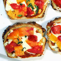 Pizza Bread... made with BEER BREAD! For the crust used a slice of the EASIEST to bake of all breads, BEER BREAD! For the toppings, the classic original Italian pizza, the Margherita (named for an old queen, not the tequila drink)... Tomatoes, Mozzarella and Basil. WORKS GREAT AND FRESH HOT HOME Pizzeria QUALITY IN MINUTES!