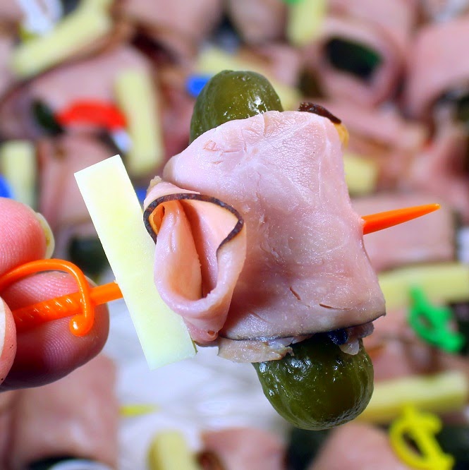 Food on a stick! A Little stick, just a single bite, sweet gherkin pickles, wrapped in Black Forest Ham and a bit of cheese. Sounds like a sandwich with out the bread. Sounds like something those always present Low Carb Dieters would take a gobble of!
