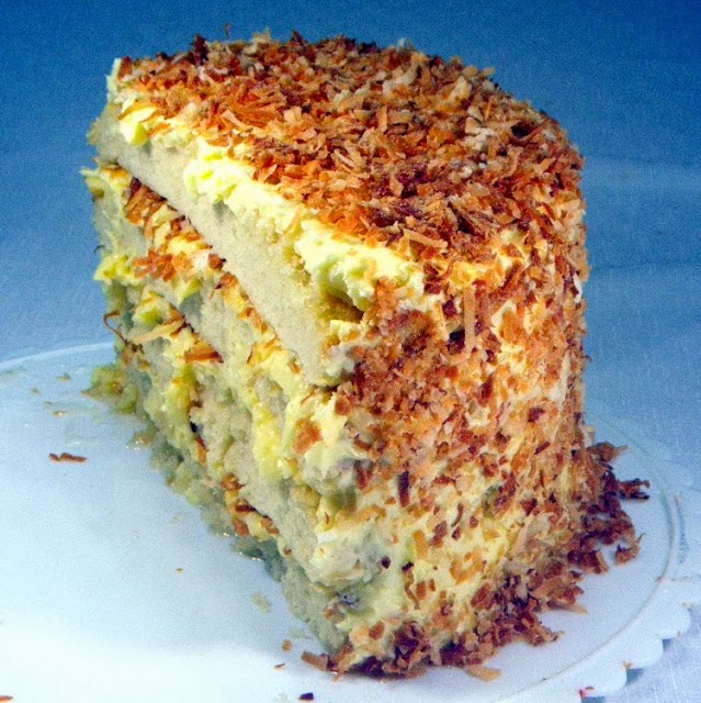 Toasted Coconut Cake - 4 Tiers, Custard Filling, Buttercream Icing and 1/2 the Calories... Hey, this cake takes some work but it is SO MUCH WORTH IT. Everything is broken down so it is time consuming BUT EVERYTHING IS EASY. And a way to make this decadent cake for just two people. Anyone snowed in, make this a winter DIY project