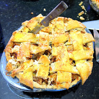 ... Sure looks like a pizza. But it's an Apple Pie. And it's a handy little recipe to have around. MUCH LESS SUGAR than in a "standard Apple Pie". Only 3 TBS of sugar in the filling, less than a teaspoon in each slice... less than the sugar many folks put in a cup of coffee. I LOVE THIS RECIPE. Takes very little hands on time A wonderful payoff in deliciousness, and a wonderful presentation.