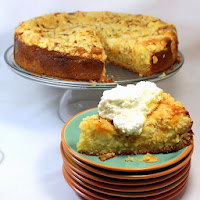 A WONDERFUL Cake that is a bit hard to name. Half is a cheesecake, so that had to be in the name but it is also an Almond flavored coffee cake. IT IS SOOOO EASY. Just pick a favorite Jam or Jelly and away you go...This was Pineapple Jam but Peach, Cherry, Apple... You name it works just fine!