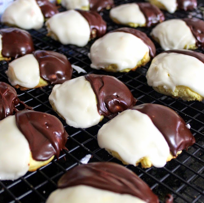 Symbolic of the racial unity always found in the big city??? Or a wonderful Lemon Cake Cookie with both Vanilla AND Chocolate Icing. Sometimes called Half and Halfs or Half Moons or in Germany - The AMERIKANER. Found in any of NYC's Delis, Now can be made EASY in your home!